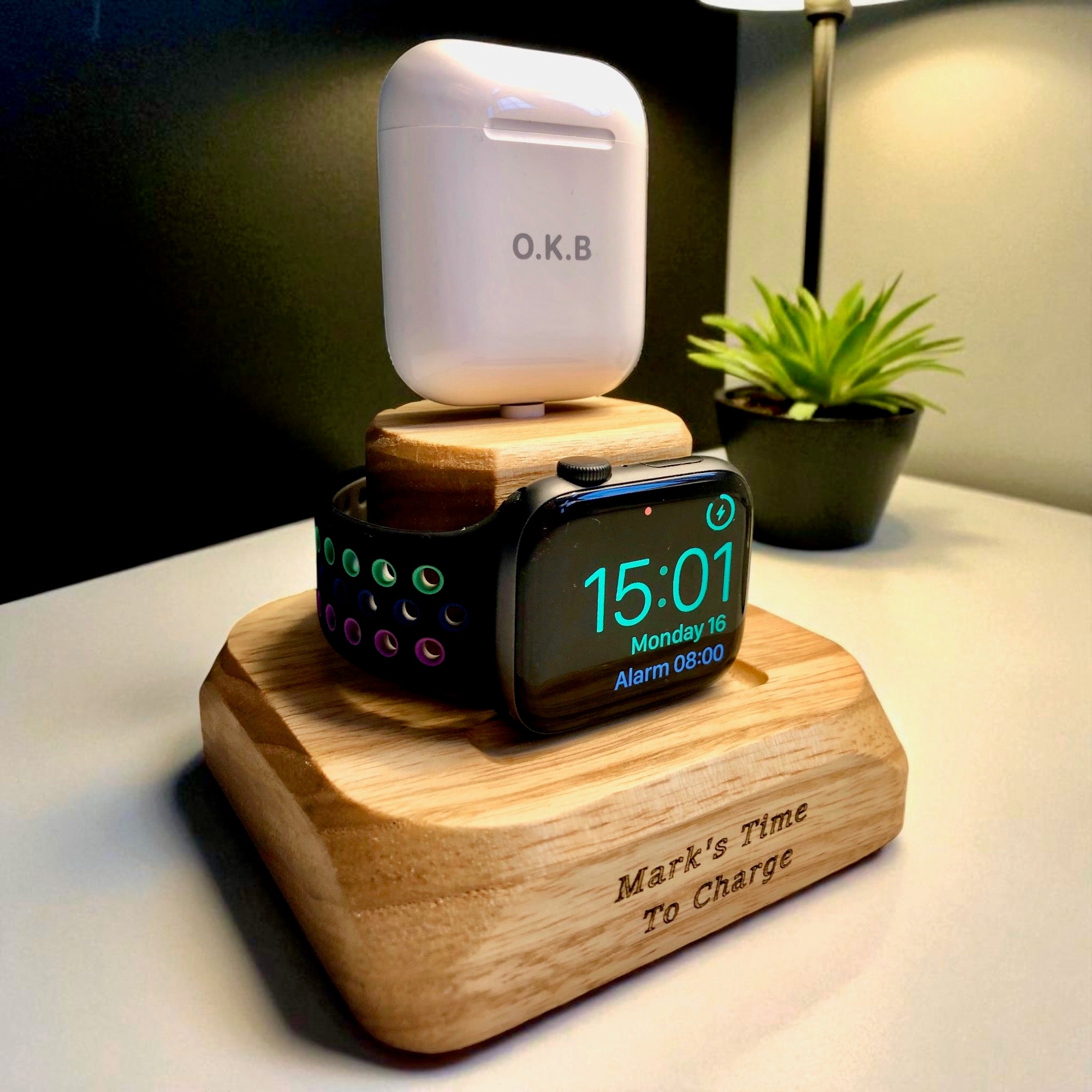 This elegant contemporary stand would be ideal on a desk or bedside table. A perfect gift for the tech lover who has both AirPods and Apple Watch.